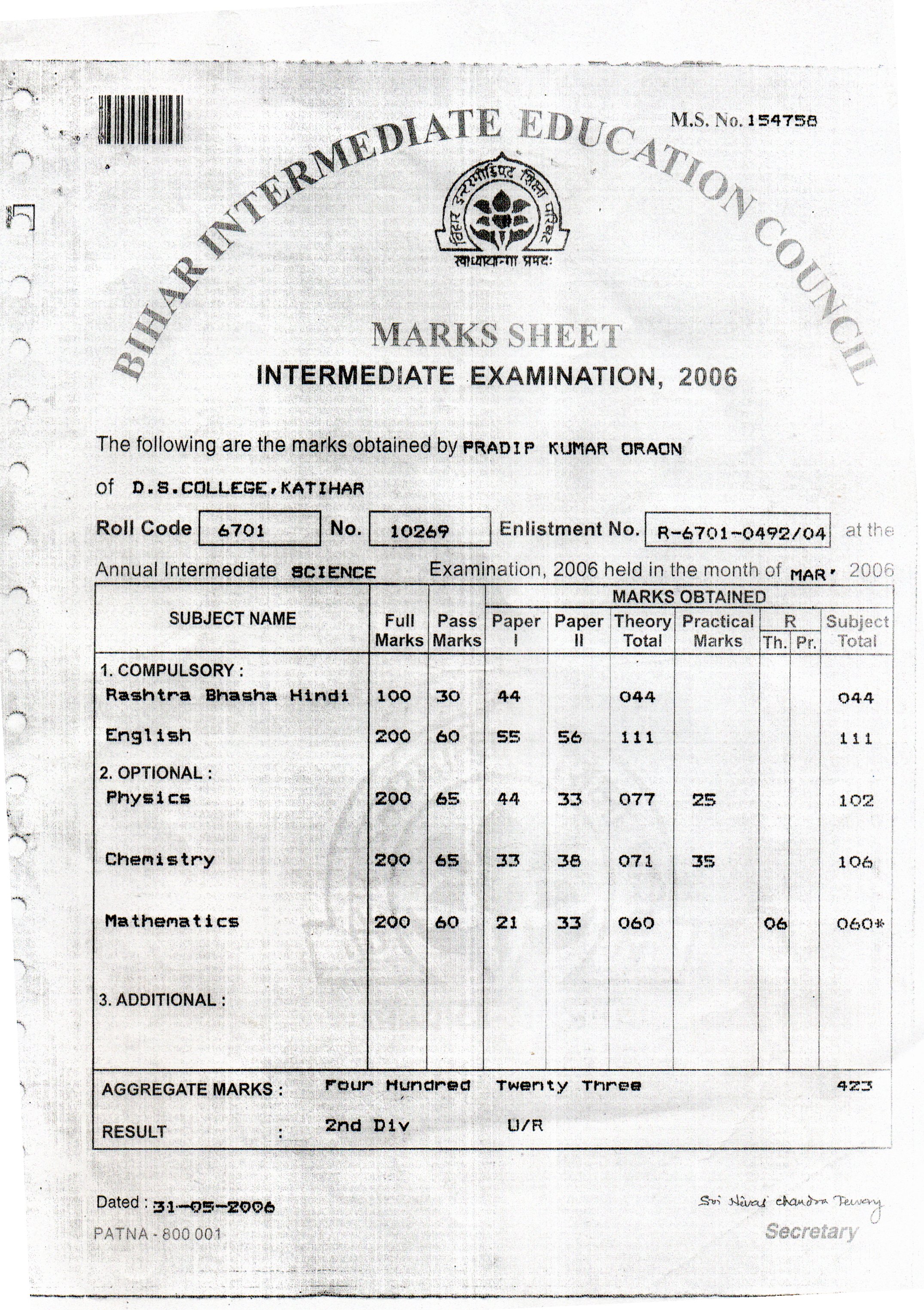 | Exam | Full Marks | Pass Marks | Marks Obtained |