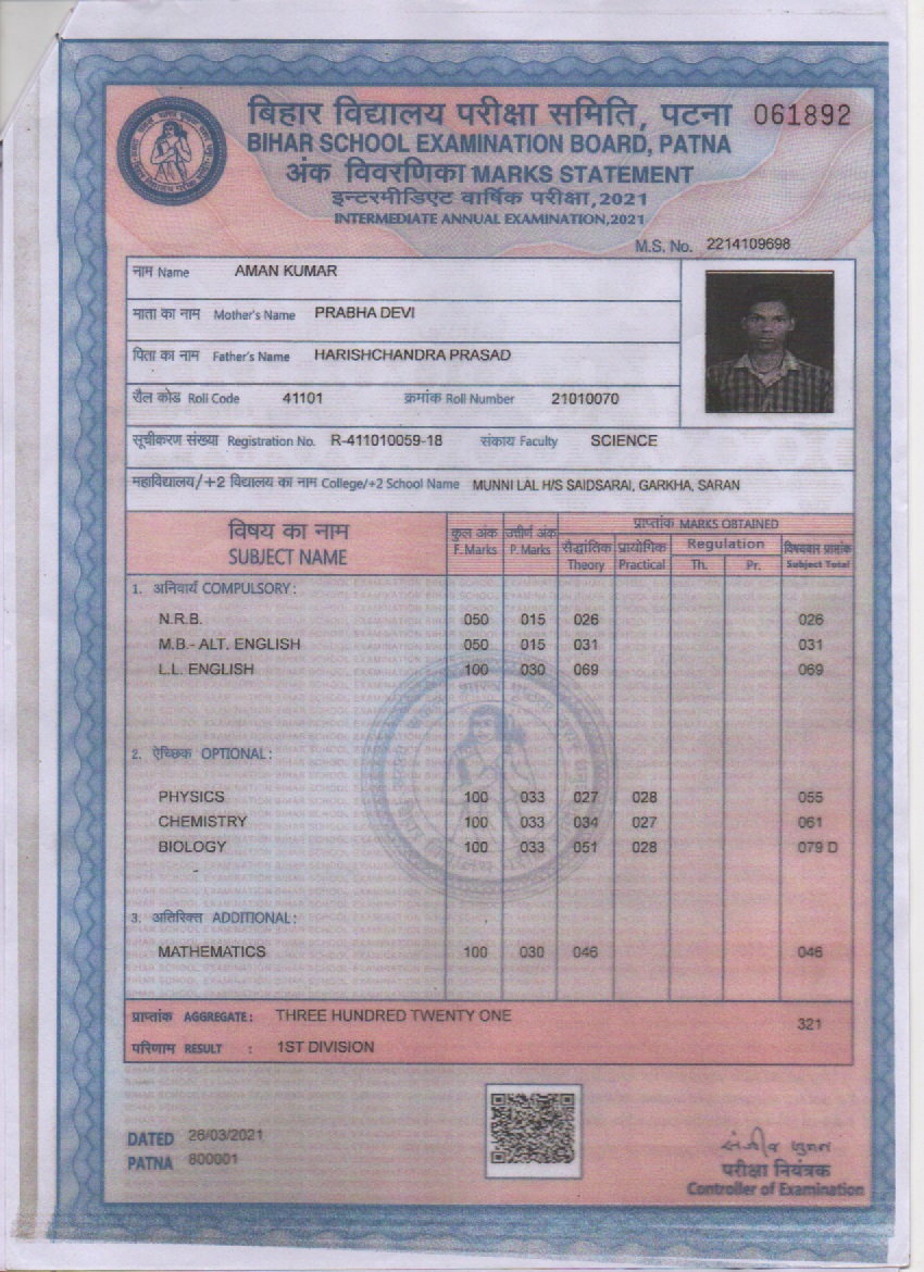 | Exam | Full Marks | Pass Marks | Marks Obtained |