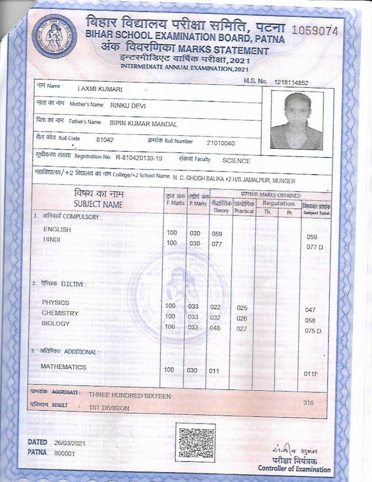 | Exam | Full Marks | Pass Marks | Marks Obtained |