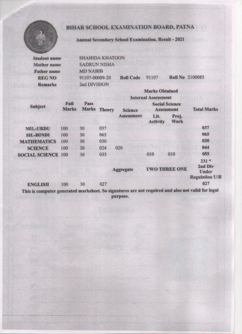 | Exam | Full Marks | Pass Marks | Marks Obtained |