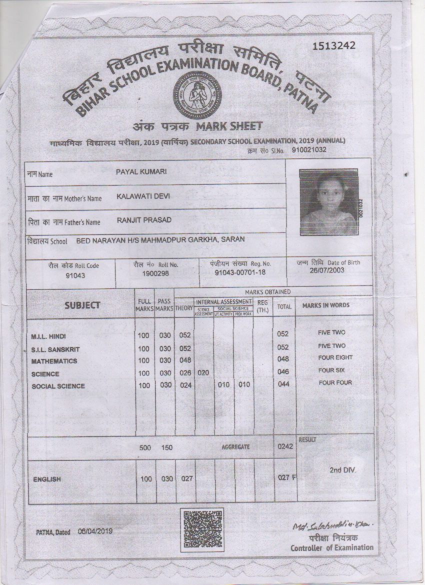 | Exam | Full Marks | Pass Marks | Marks Obtained |