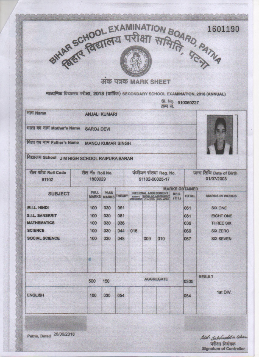 | Exam | Full Marks | Pass Marks | Marks Obtained |