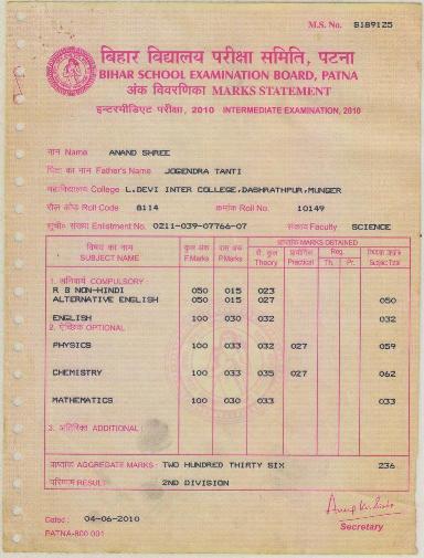 | Exam | Full Marks | Pass Marks | Marks Obtained |
