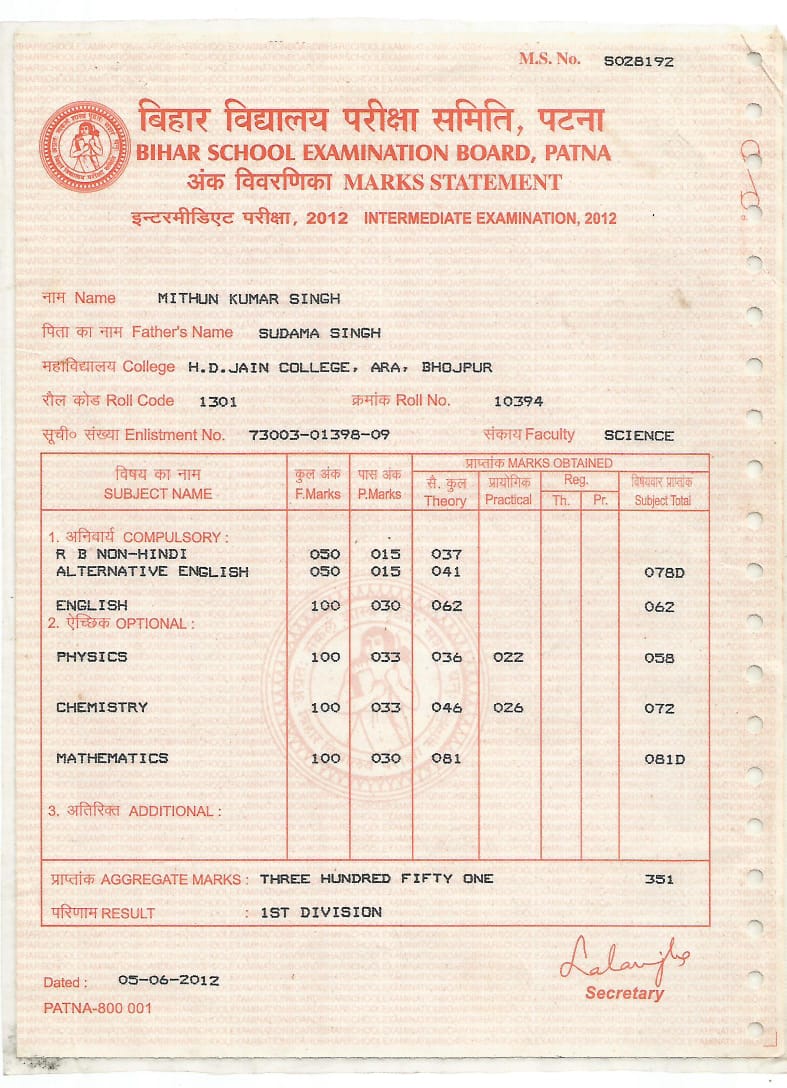 | Exam | Full Marks | Pass Marks | Marks Obtained |
