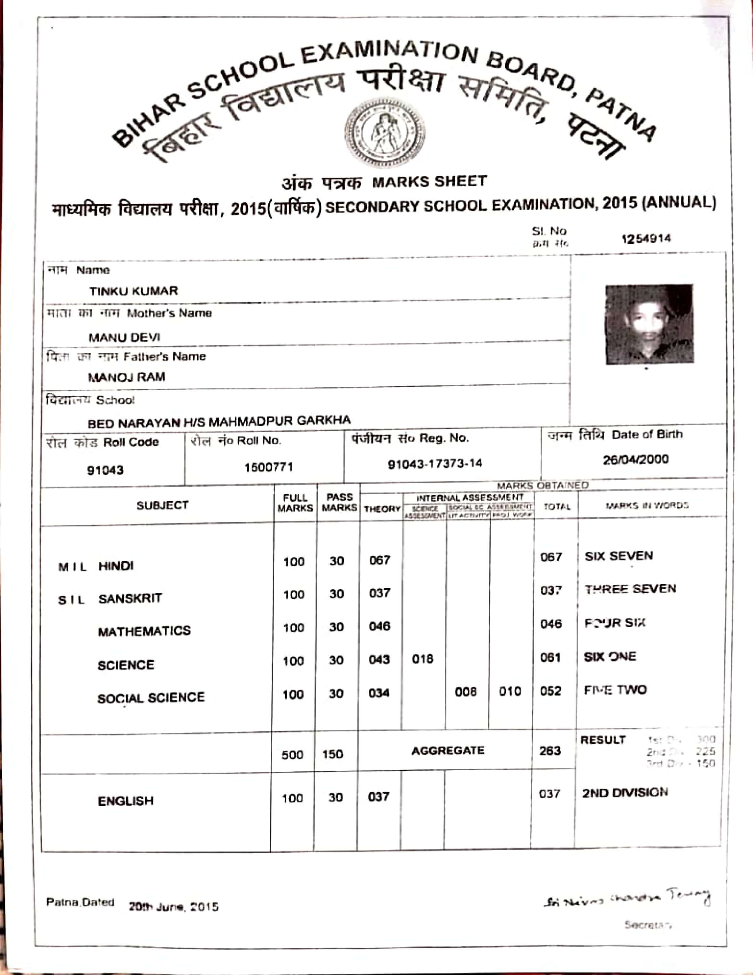 | Exam | Full Marks | Pass Marks | Marks Obtained |