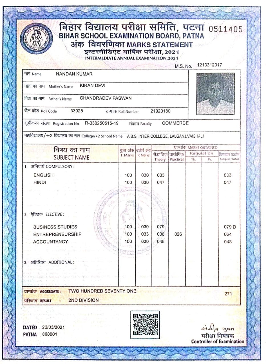 | Exam | Full Marks | Pass Marks | Marks Obtained |