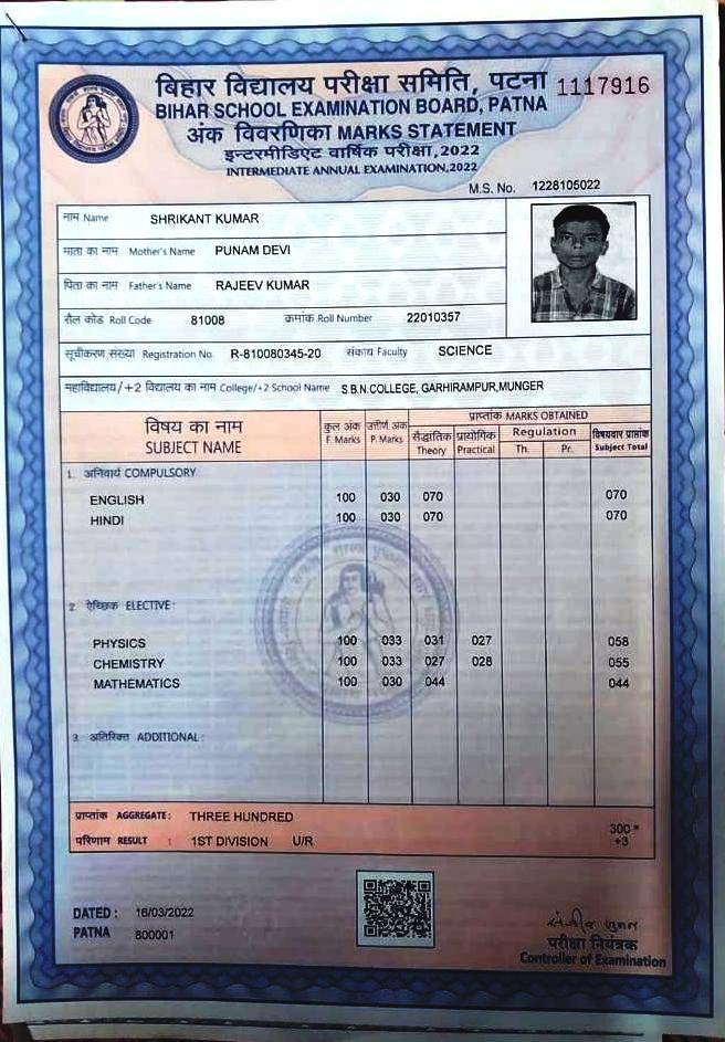 | Exam | Full Marks | Pass Marks | Marks Obtained |