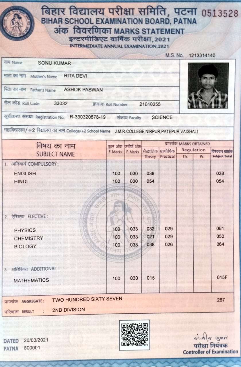 | Exam | Full Marks | Pass Marks | Marks Obtained |