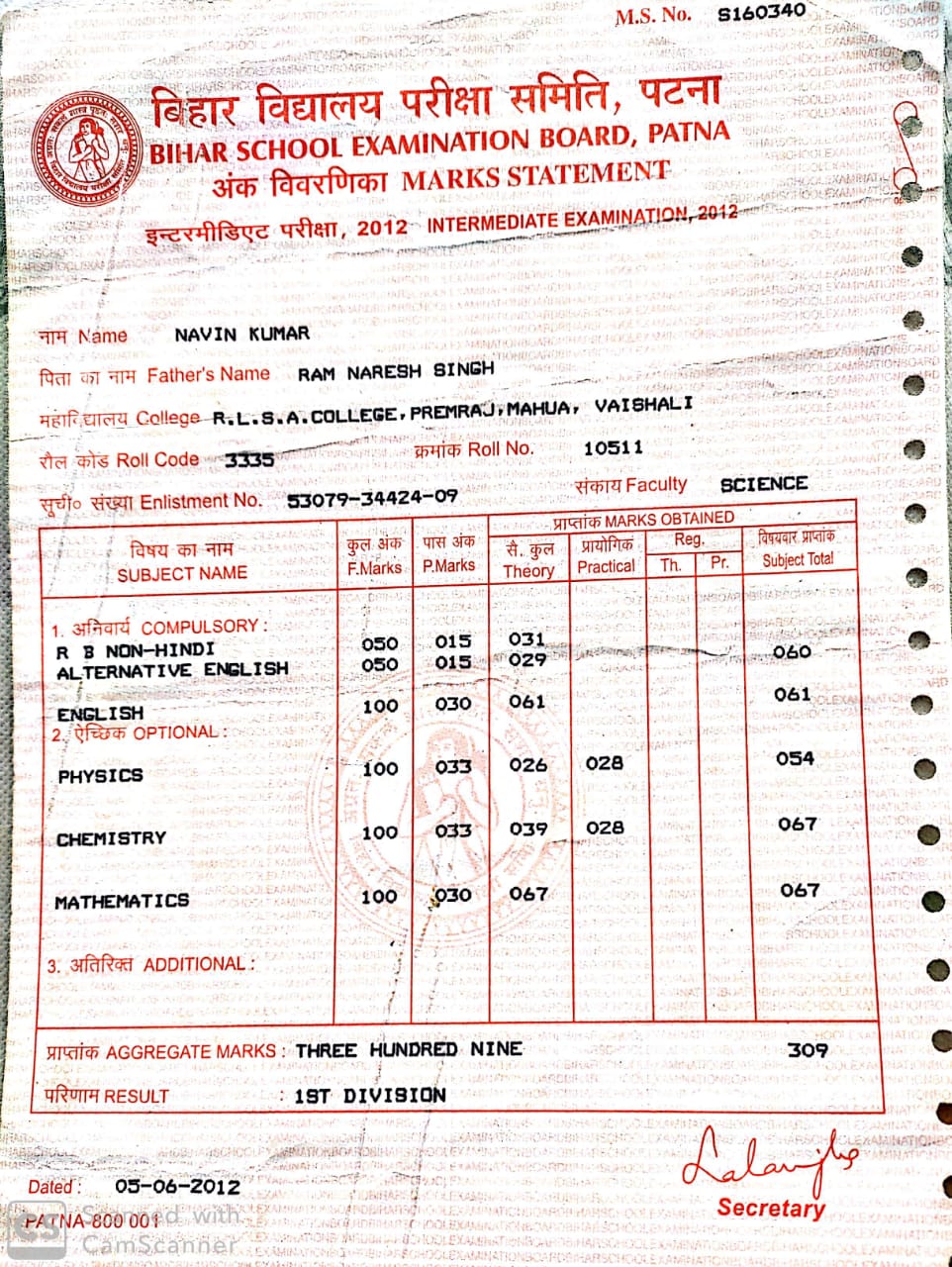 | Exam | Full Marks | Pass Marks | Marks Obtained |