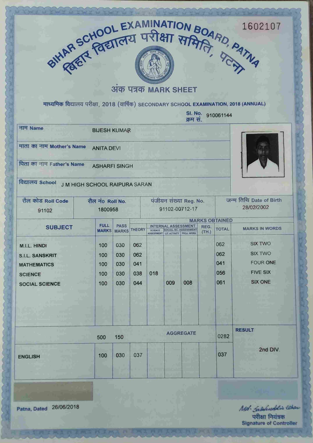 | Exam | Full Marks | Pass Marks | Marks Obtained |