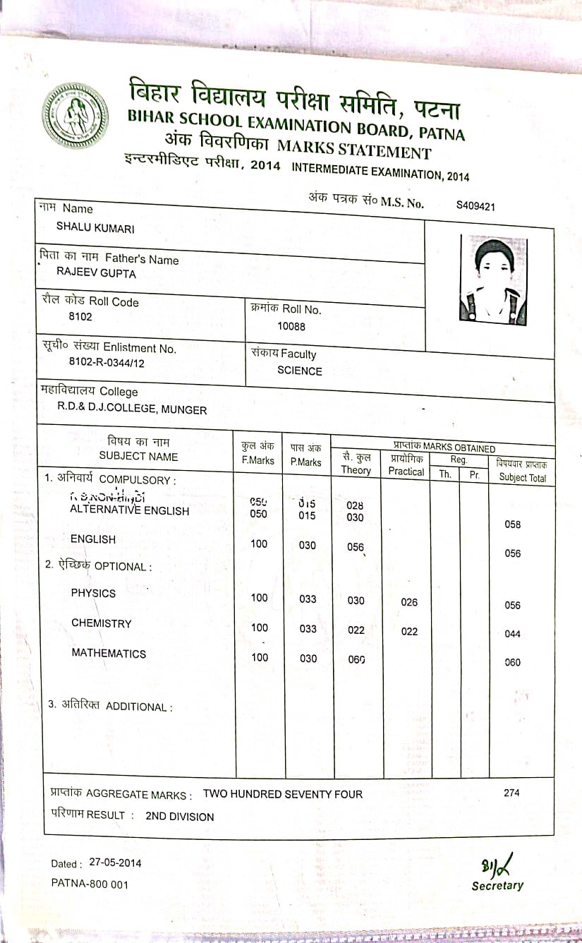 | Exam | Full Marks | Pass Marks | Marks Obtained |