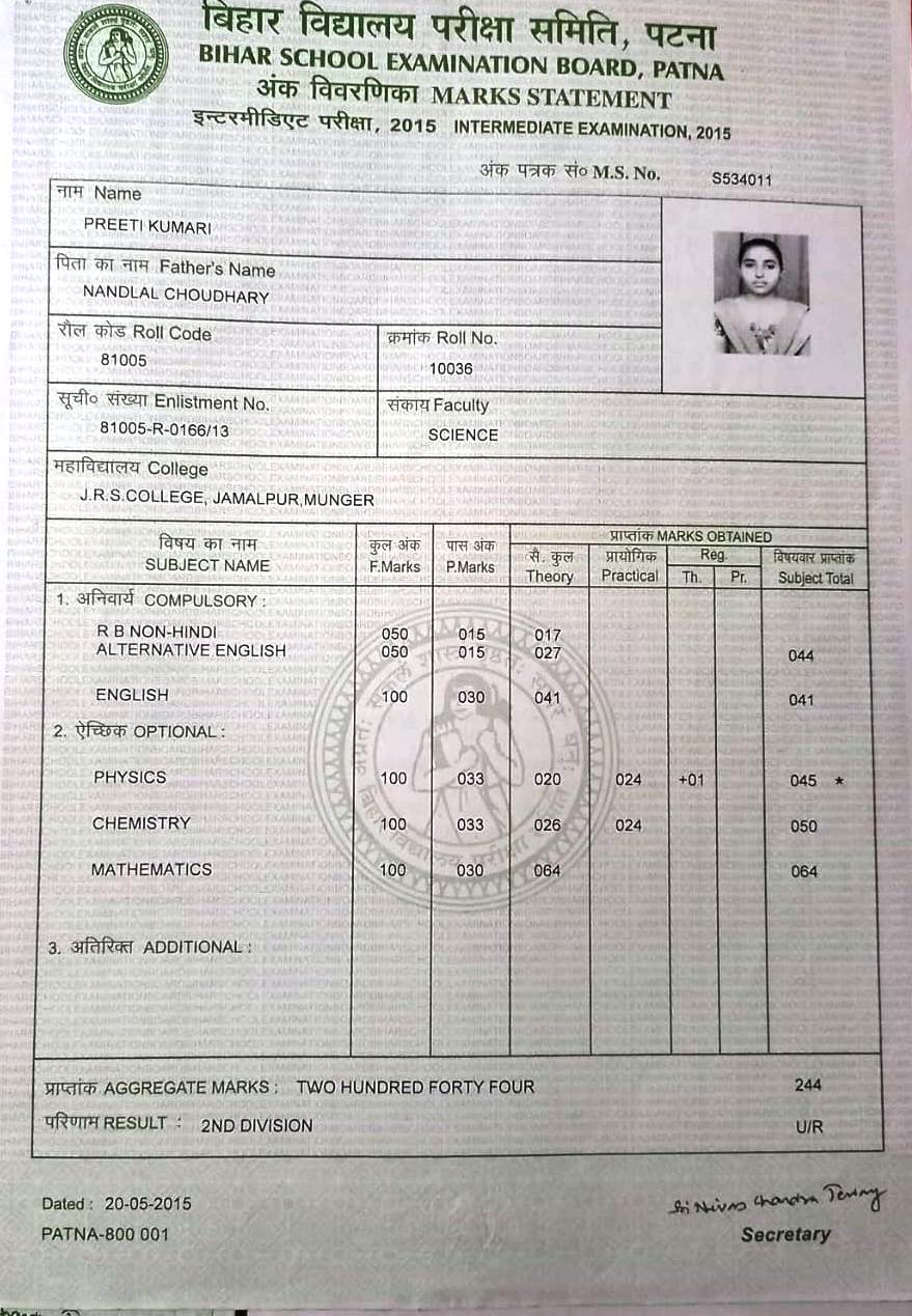 | Exam | Full Marks | Pass Marks | Marks Obtained |