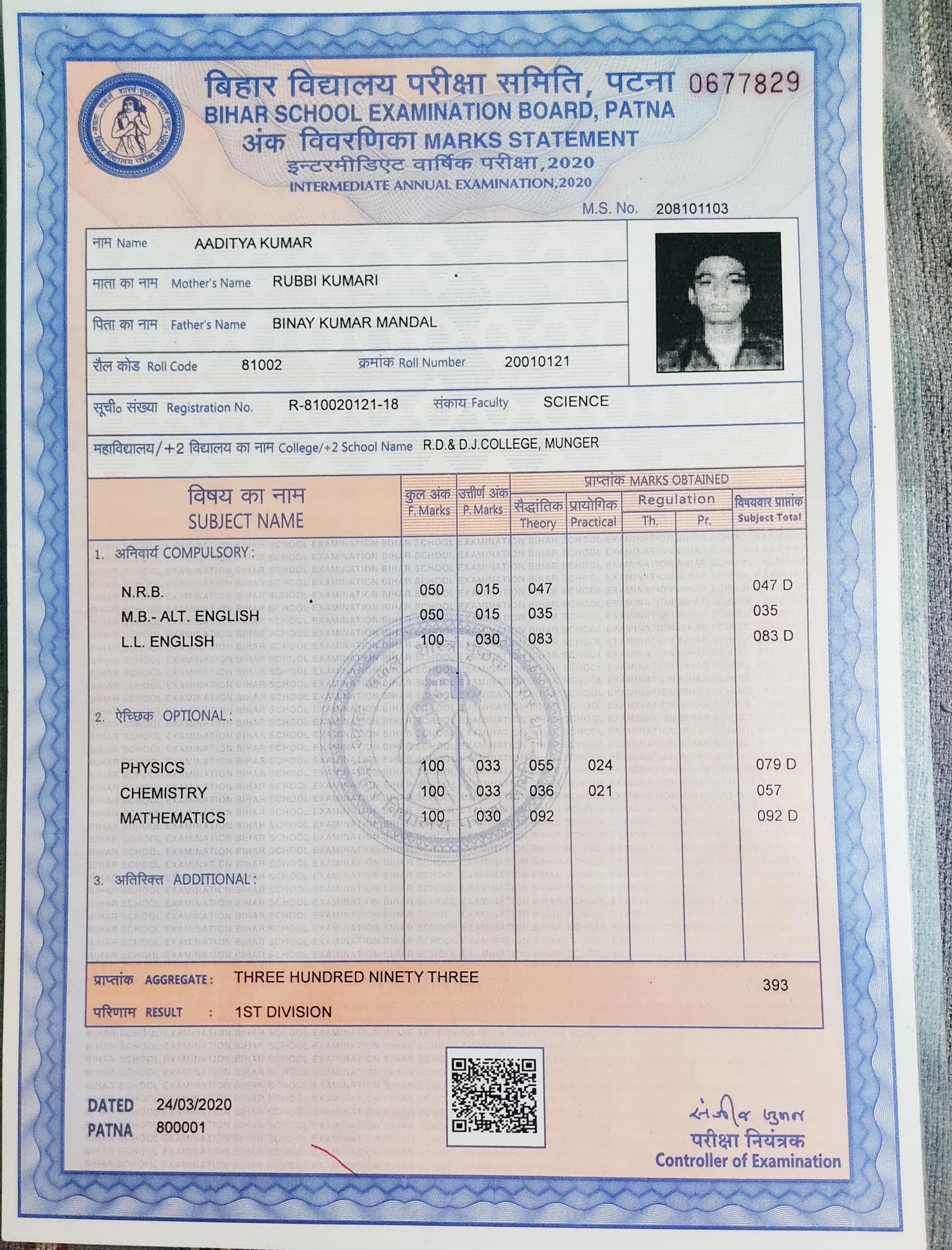 | Exam | Full Marks | Pass Marks | Marks Obtained |