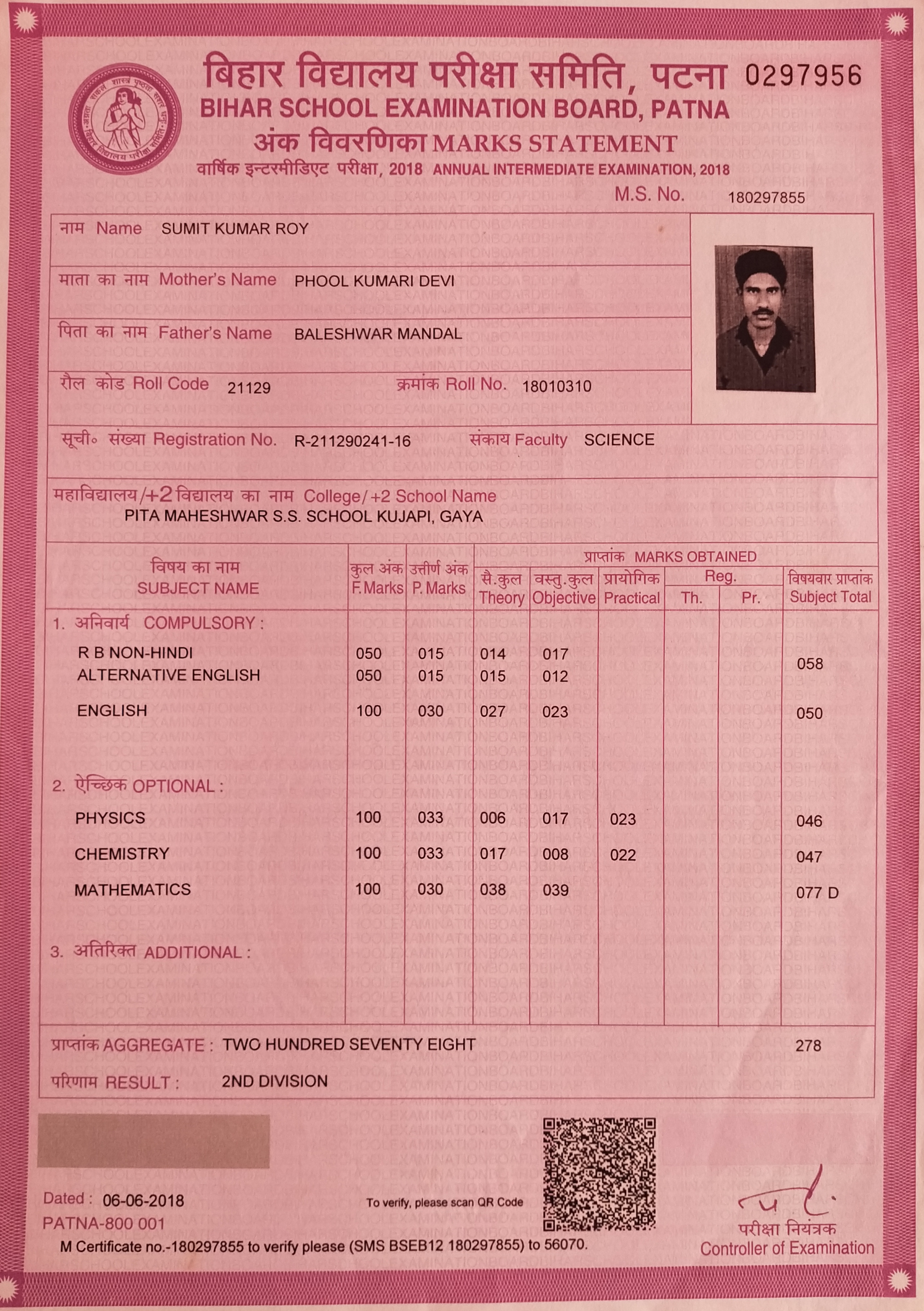 | Exam | Full Marks | Pass Marks | Marks Obtained |