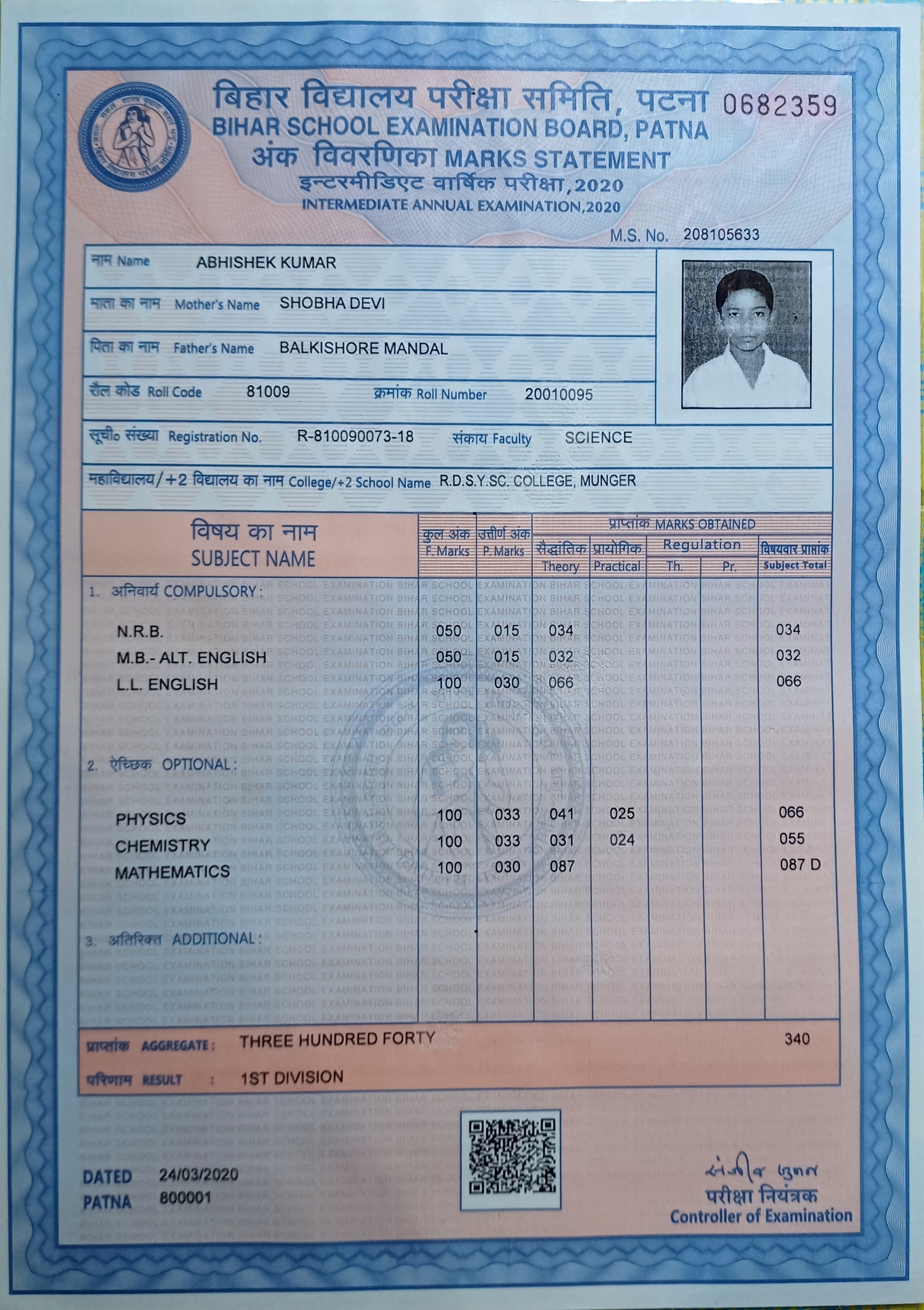 | Exam | Full Marks | Pass Marks | Marks Obtained |