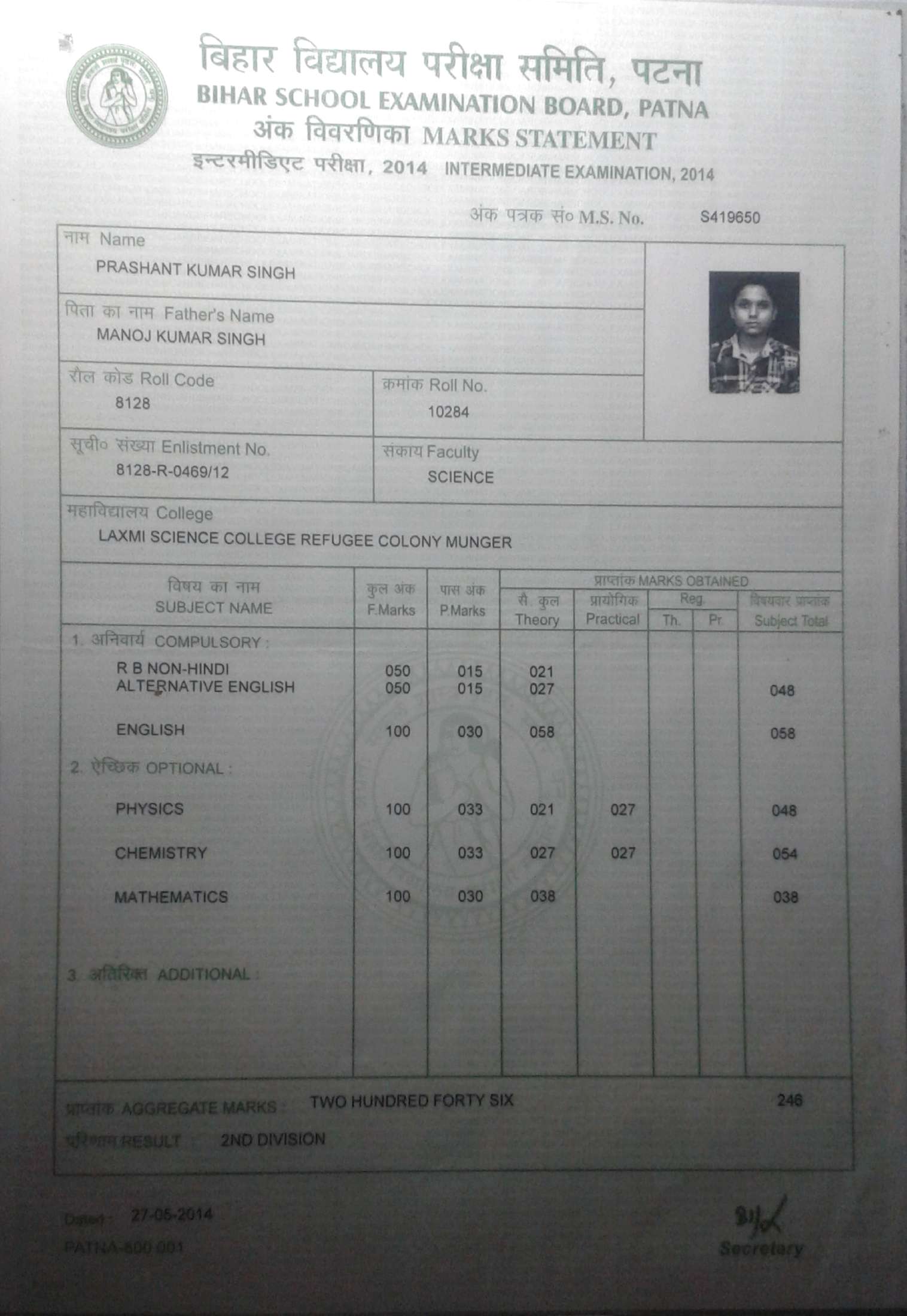 | Exam | Full Marks | Pass Marks | Marks Obtained |