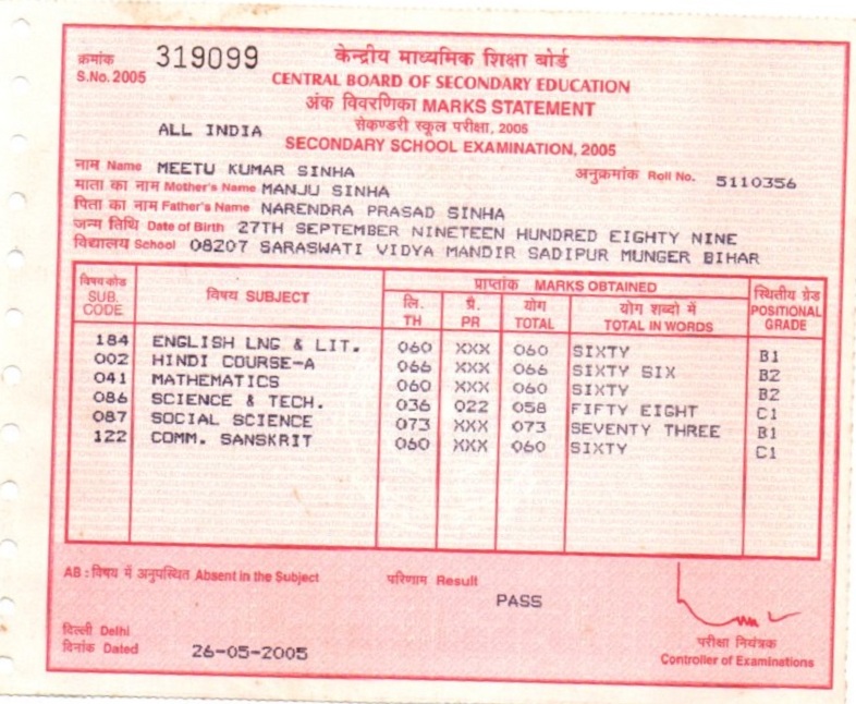 | Exam | Full Marks | Pass Marks | Marks Obtained |