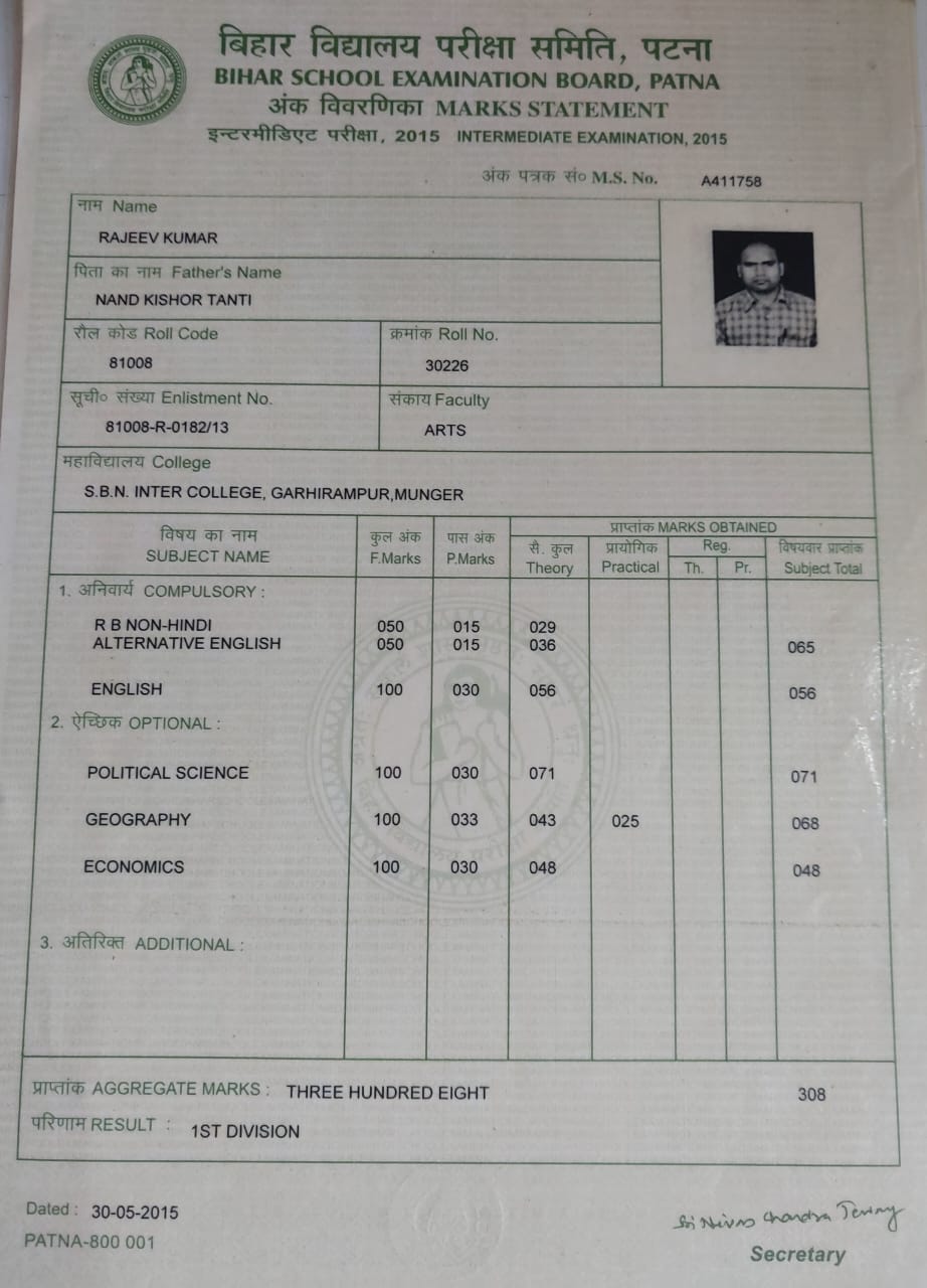 | Exam | Full Marks | Pass Marks | Marks Obtained |