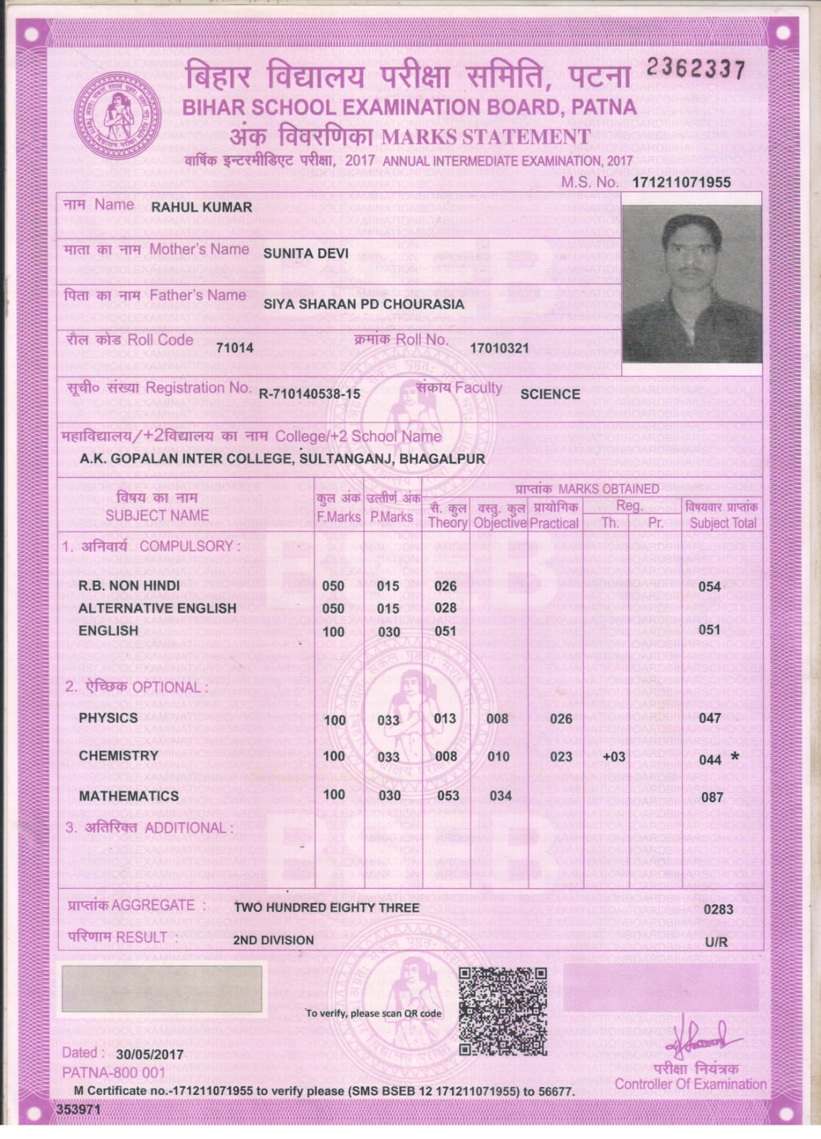 | Exam | Full Marks | Pass Marks | Marks Obtained |