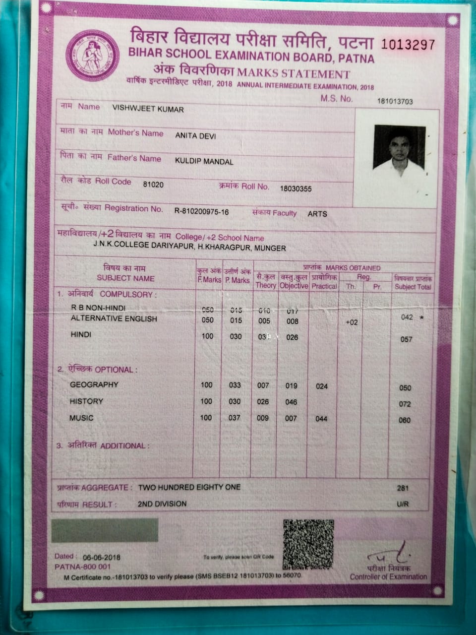 | Exam | Full Marks | Pass Marks | Marks Obtained |
