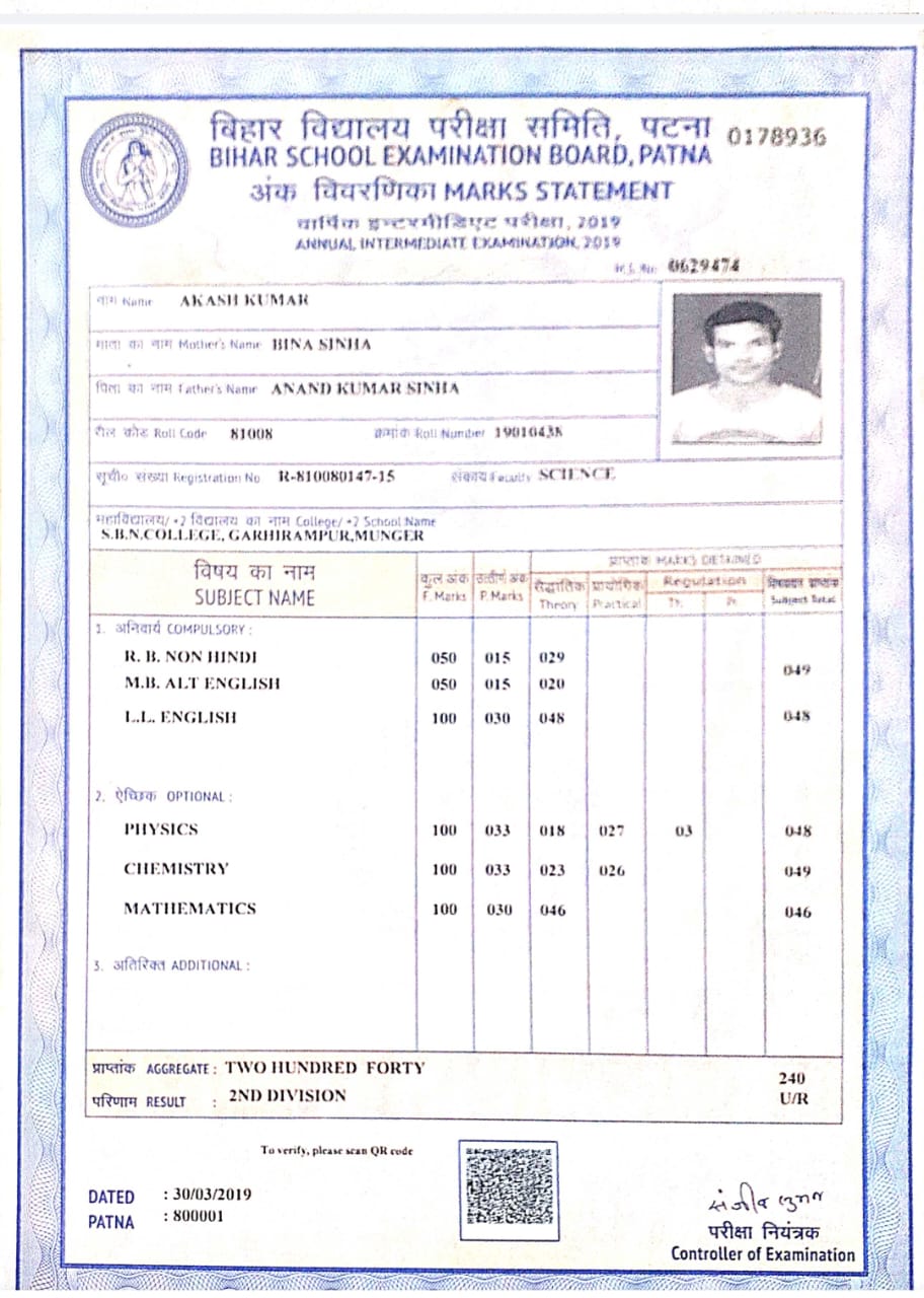 | Exam | Full Marks | Pass Marks | Marks Obtained |