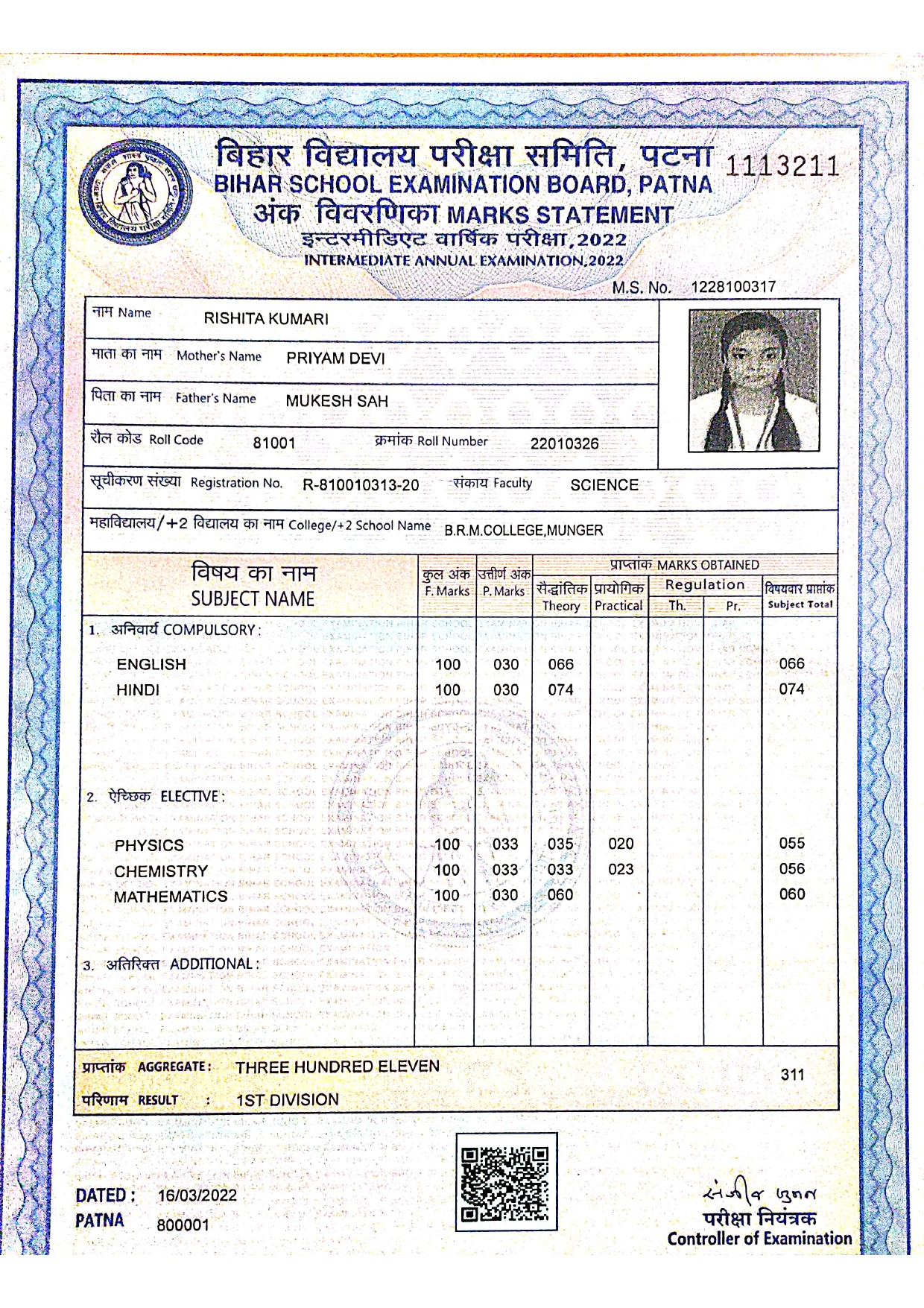 | Exam | Full Marks | Pass Marks | Marks Obtained |
