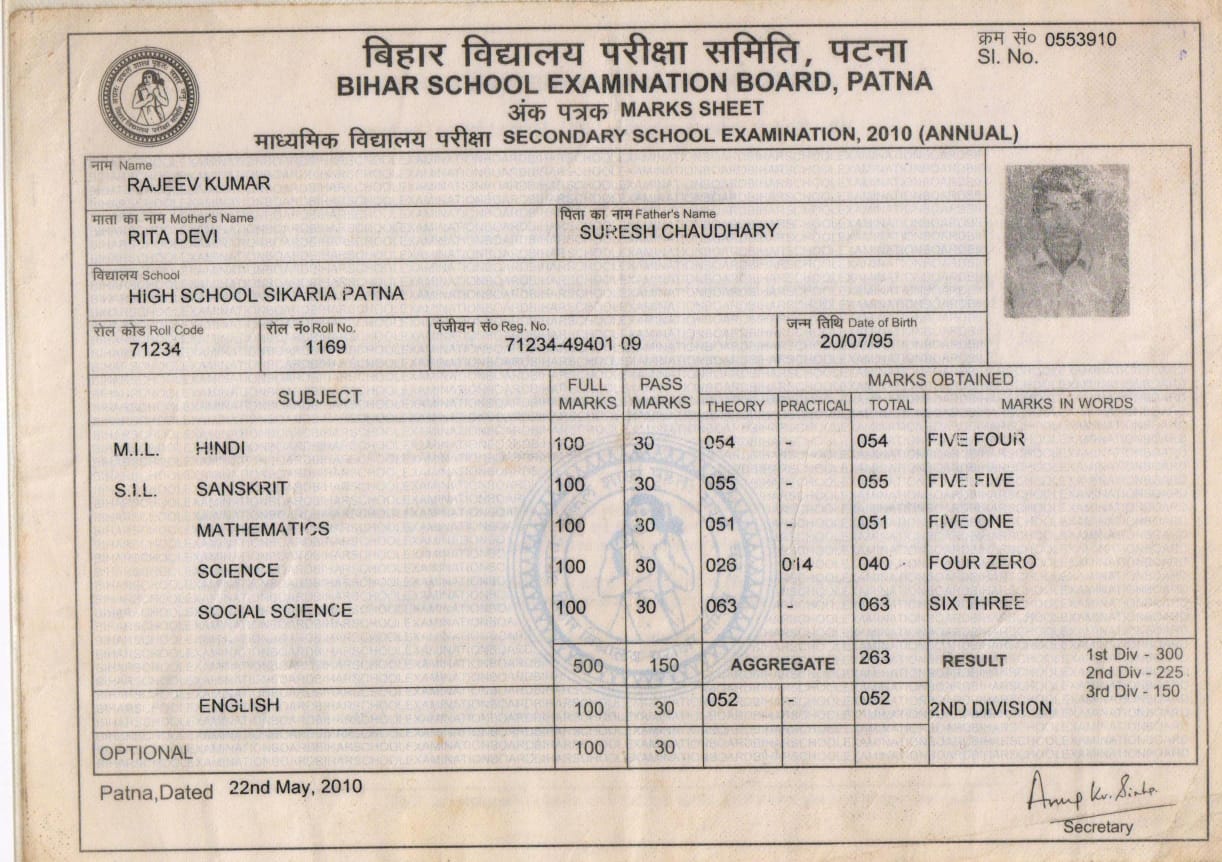 | Exam | Full Marks | Pass Marks | Marks Obtained |
