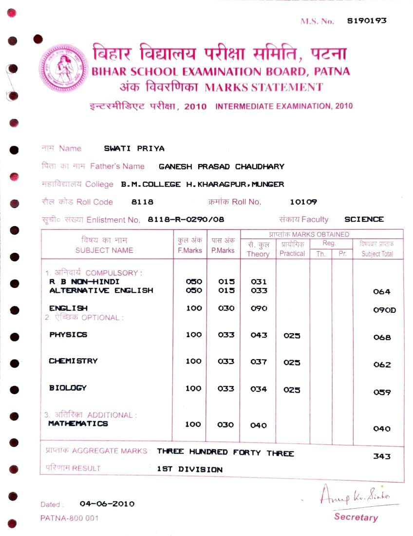 | Exam | Full Marks | Pass Marks | Marks Obtained |