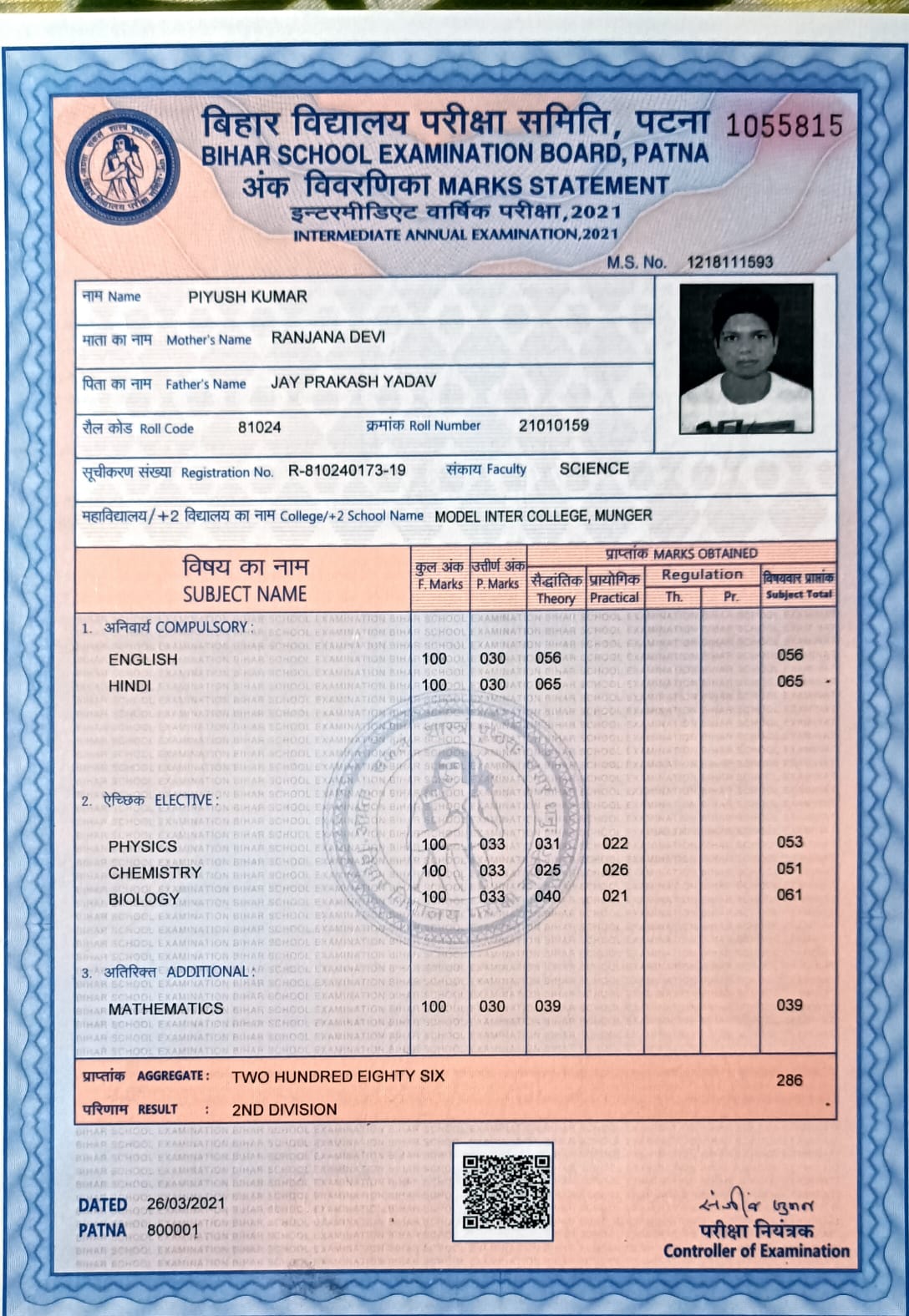 | Exam | Full Marks | Pass Marks | Marks Obtained |