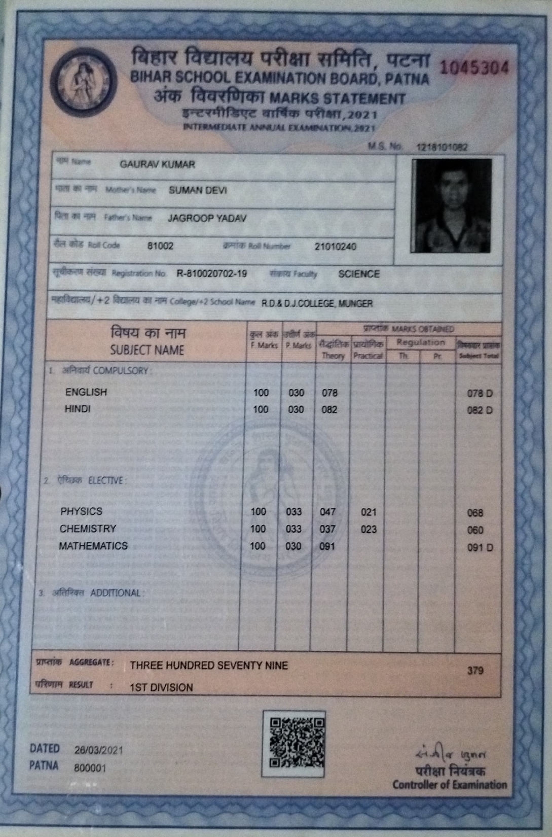 | Exam | Full Marks | Pass Marks | Marks Obtained |