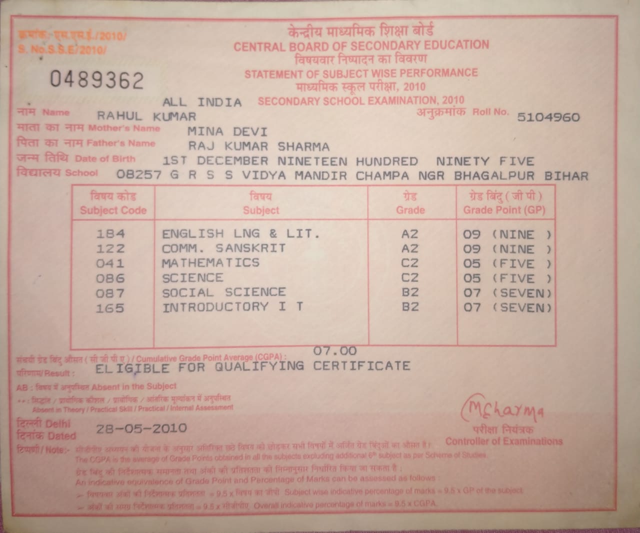 | Exam | Full Marks | Pass Marks | Marks Obtained |