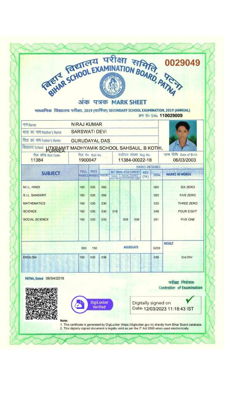 | Exam | Full Marks | Pass Marks | Marks Obtained |