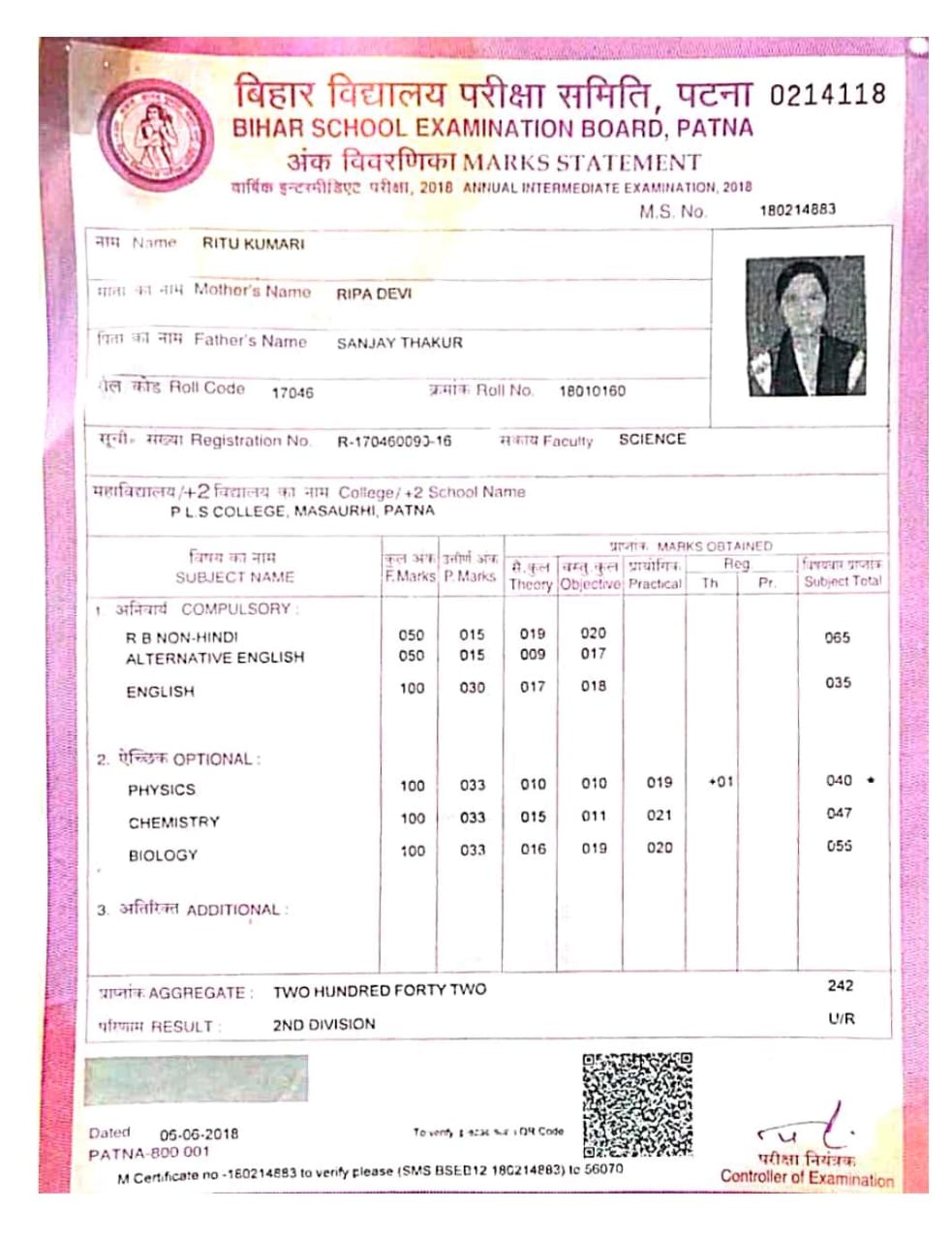 | Exam | Full Marks | Pass Marks | Marks Obtained |