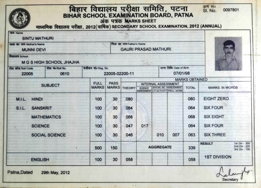 | Exam | Full Marks | Pass Marks | Marks Obtained |