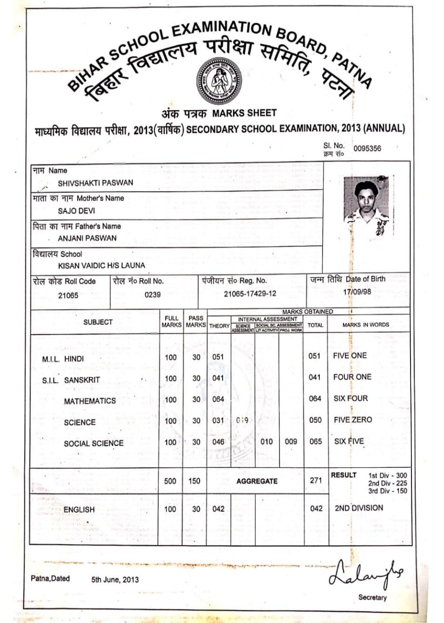 | Exam | Full Marks | Pass Marks | Marks Obtained |