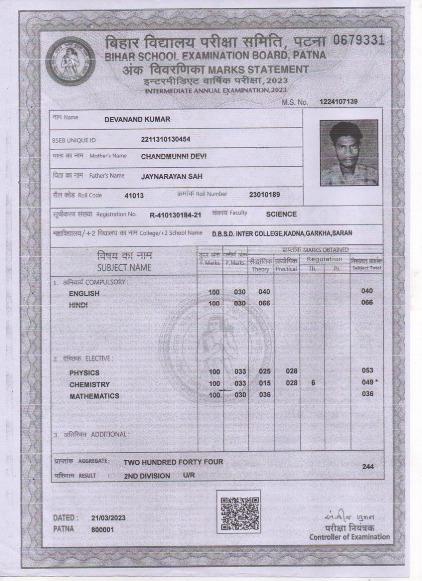| Exam | Full Marks | Pass Marks | Marks Obtained |