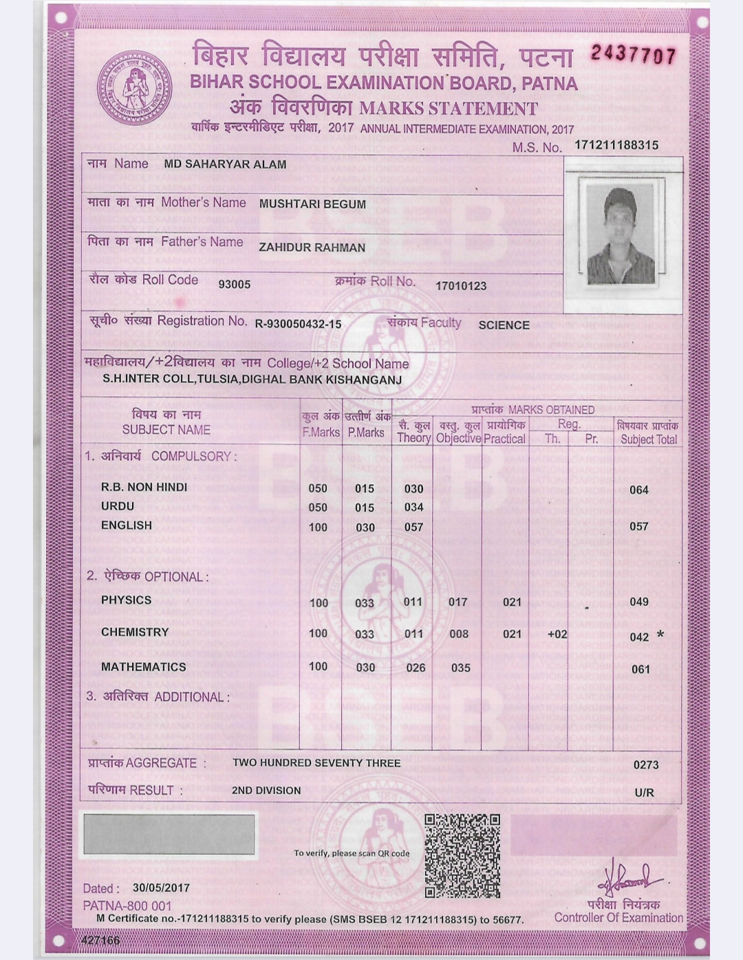 | Exam | Full Marks | Pass Marks | Marks Obtained |