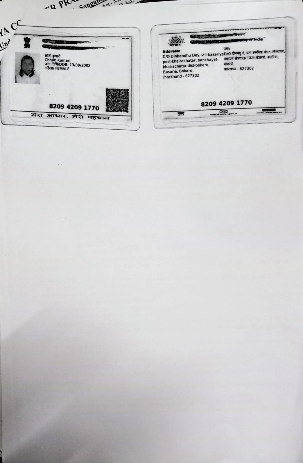| : | KHAIRACHATAR, NEAR- KHAIRACHATAR POST OFFICE, PS- KASMAR, BOKARO JHARKHAND - 827302, Bokaro | |