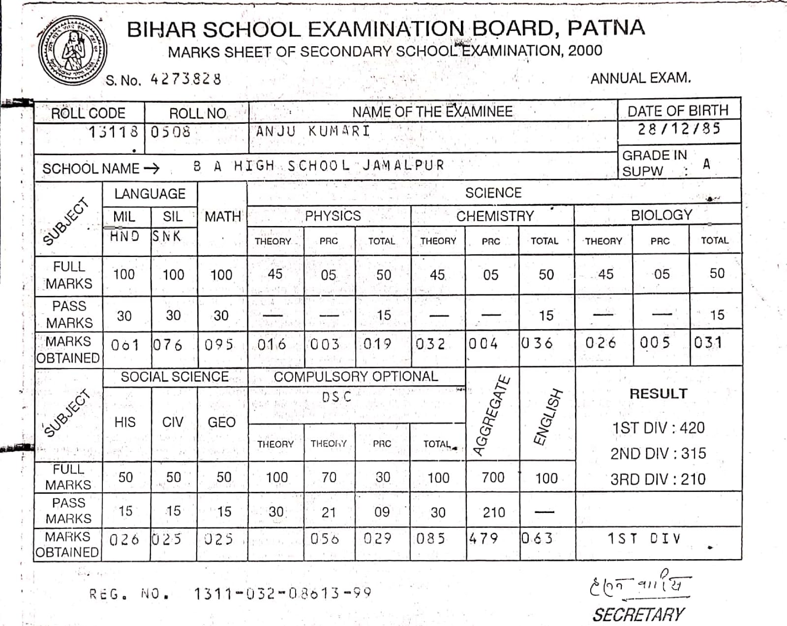 | Exam | Full Marks | Pass Marks | Marks Obtained |
