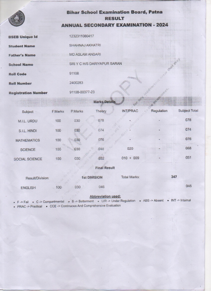 | Exam | Full Marks | Pass Marks | Marks Obtained |