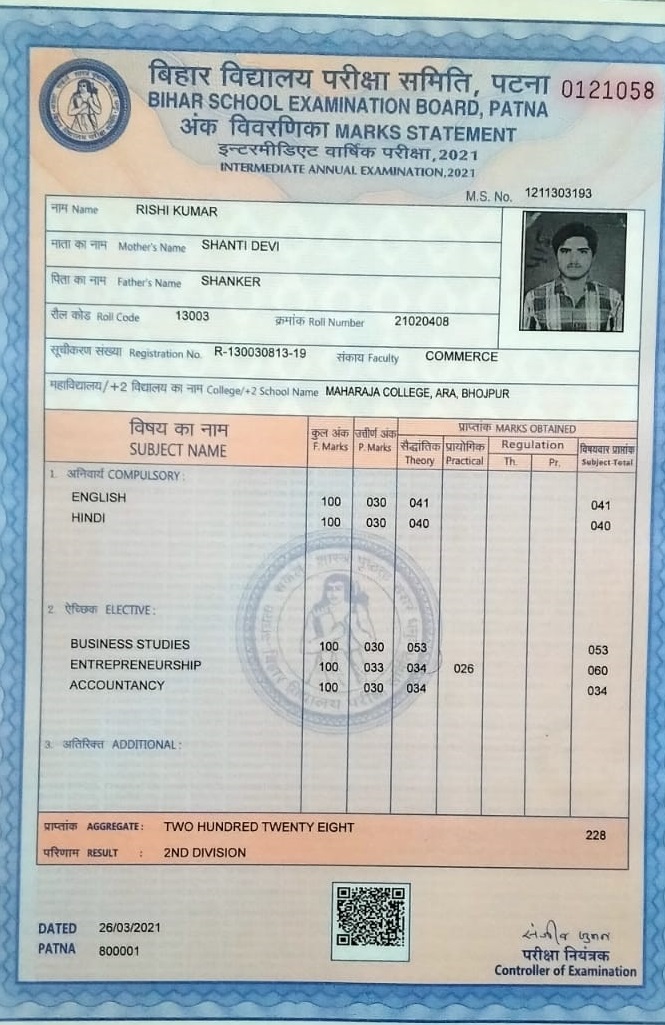 | Exam | Full Marks | Pass Marks | Marks Obtained |
