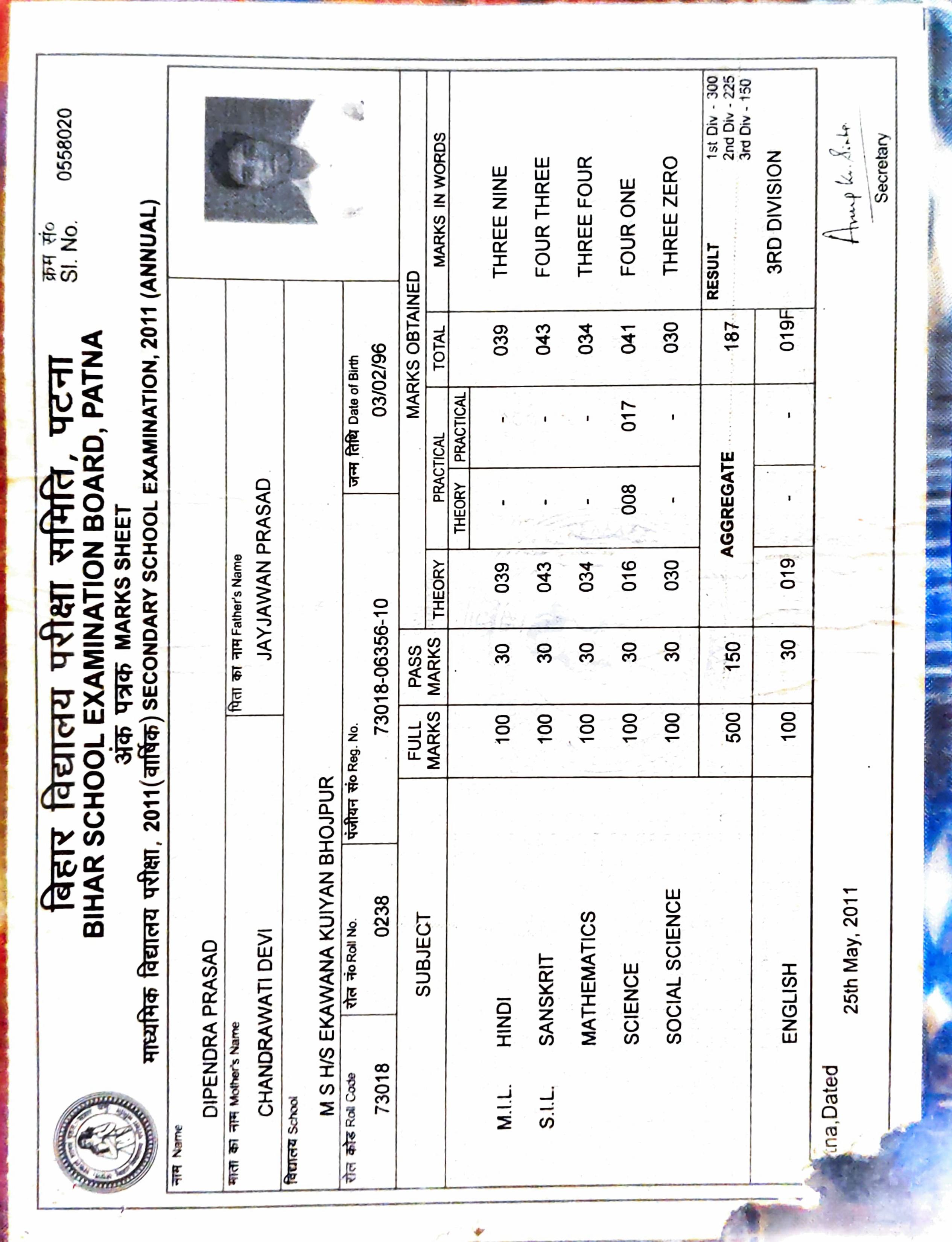| Exam | Full Marks | Pass Marks | Marks Obtained |