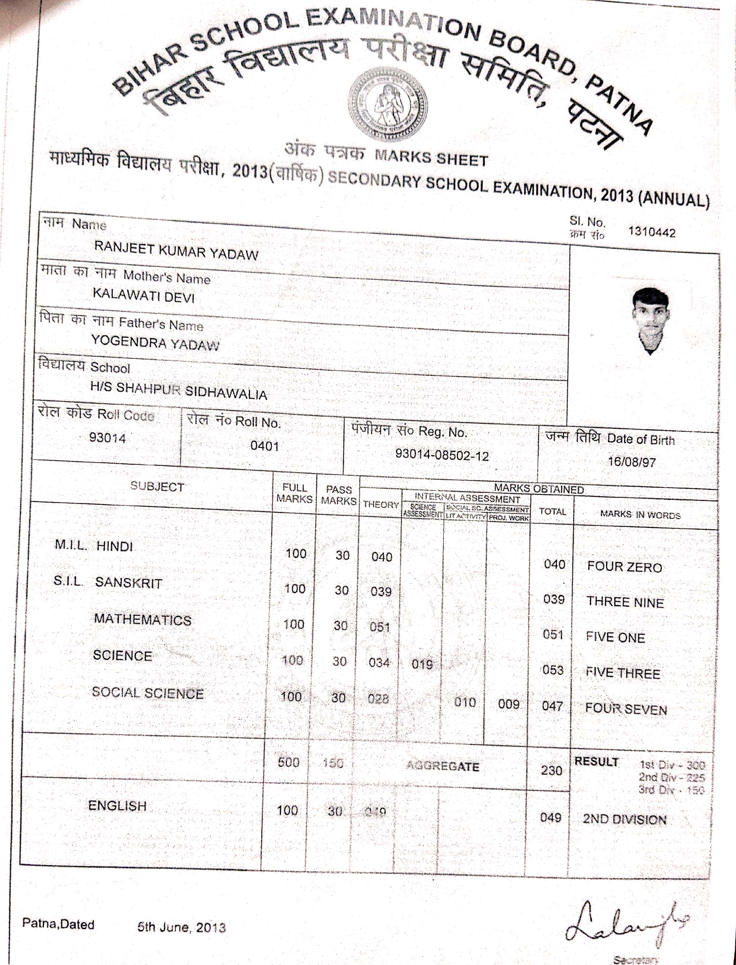 | Exam | Full Marks | Pass Marks | Marks Obtained |