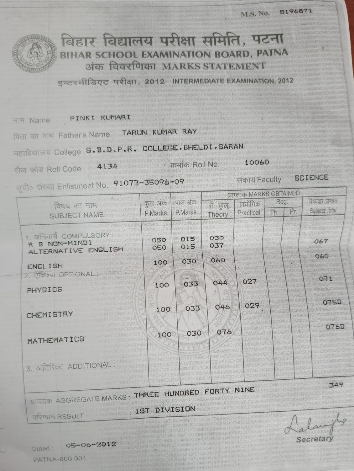 | Exam | Full Marks | Pass Marks | Marks Obtained |