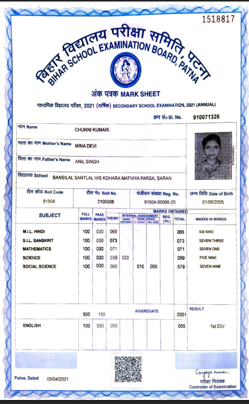 | Exam | Full Marks | Pass Marks | Marks Obtained |