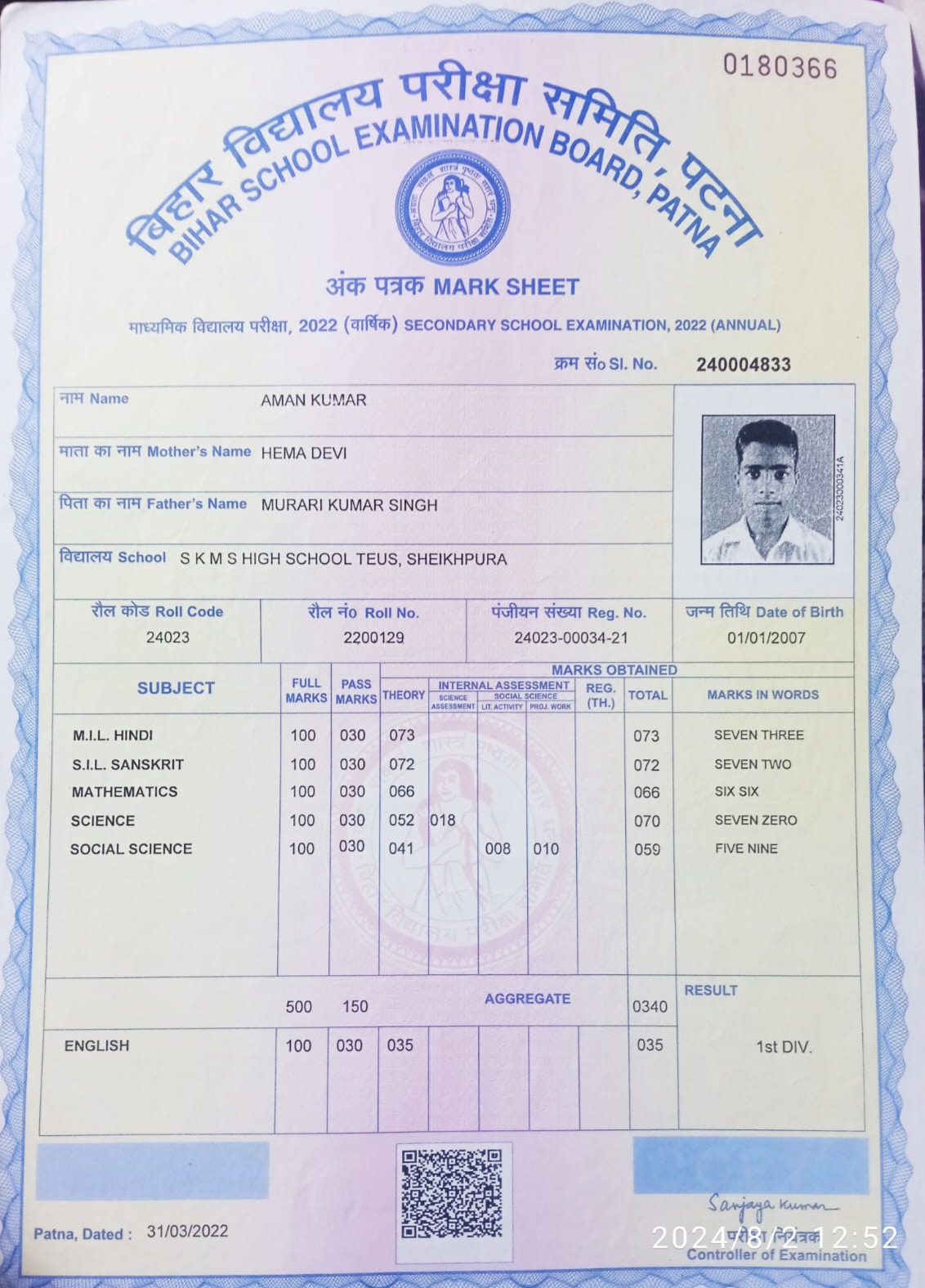 | Exam | Full Marks | Pass Marks | Marks Obtained |