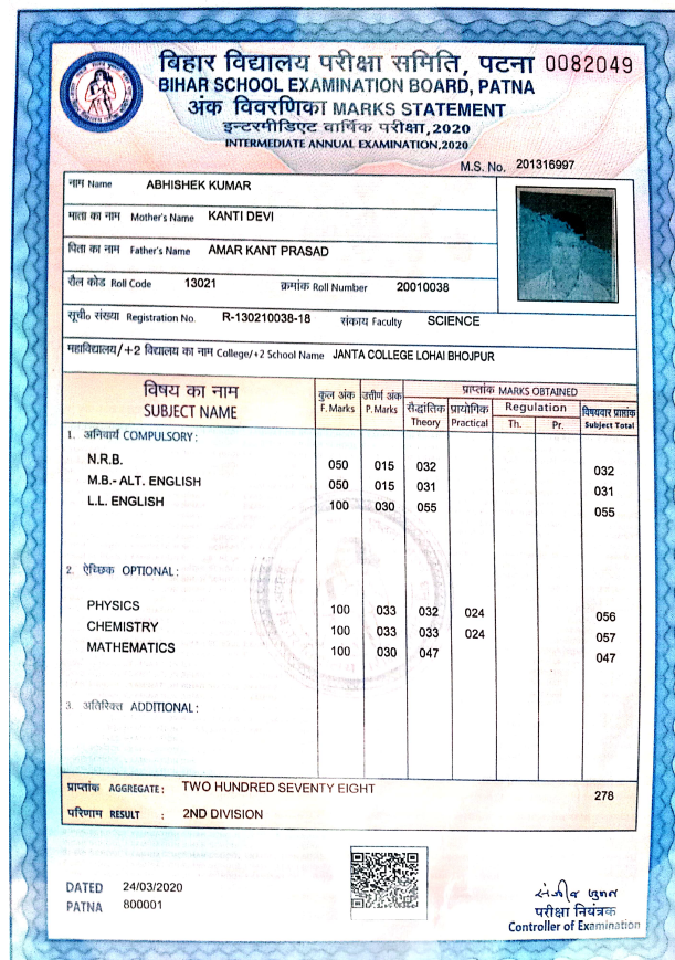 | Exam | Full Marks | Pass Marks | Marks Obtained |