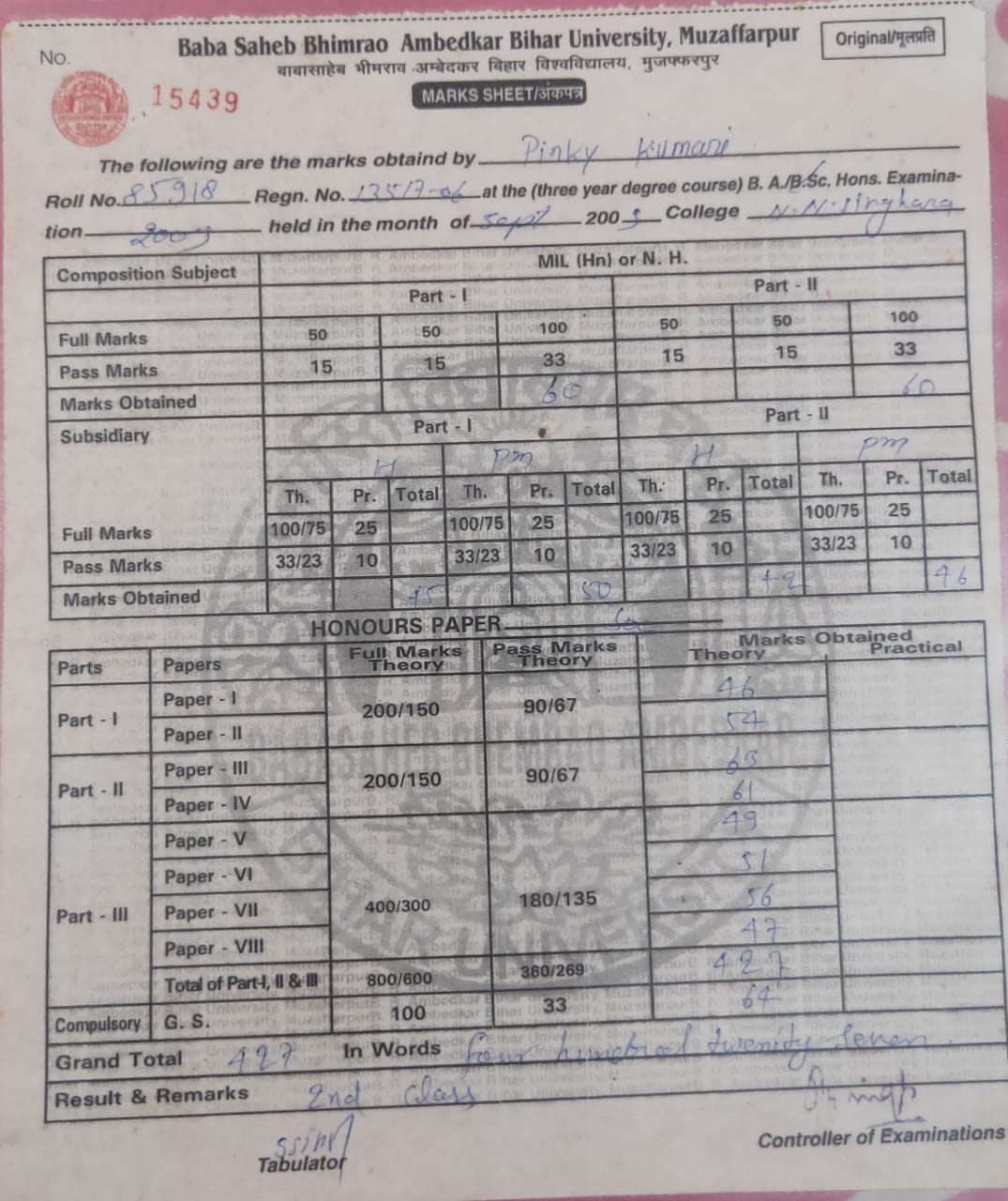 | Exam | Full Marks | Pass Marks | Marks Obtained |