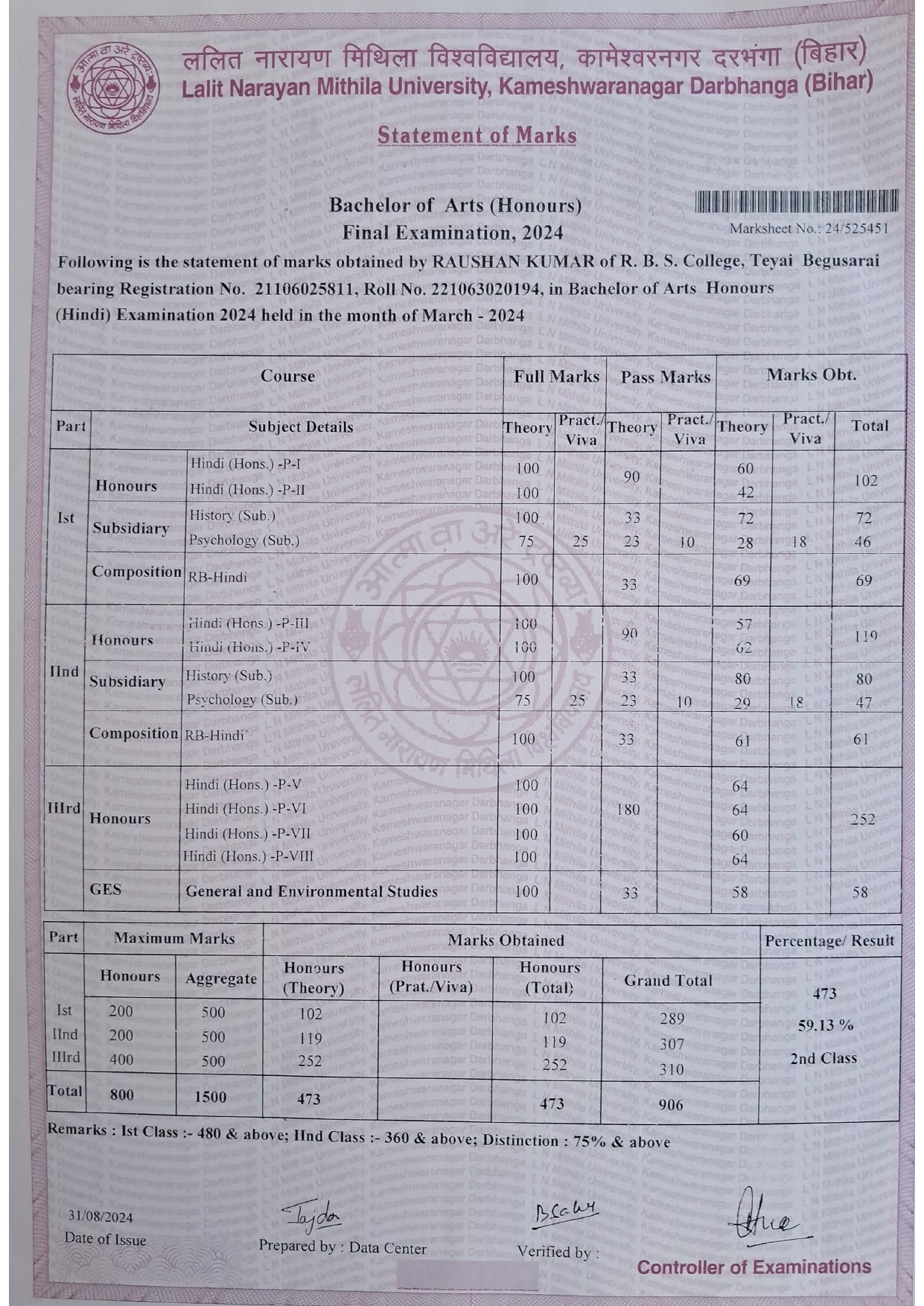 | Exam | Full Marks | Pass Marks | Marks Obtained |