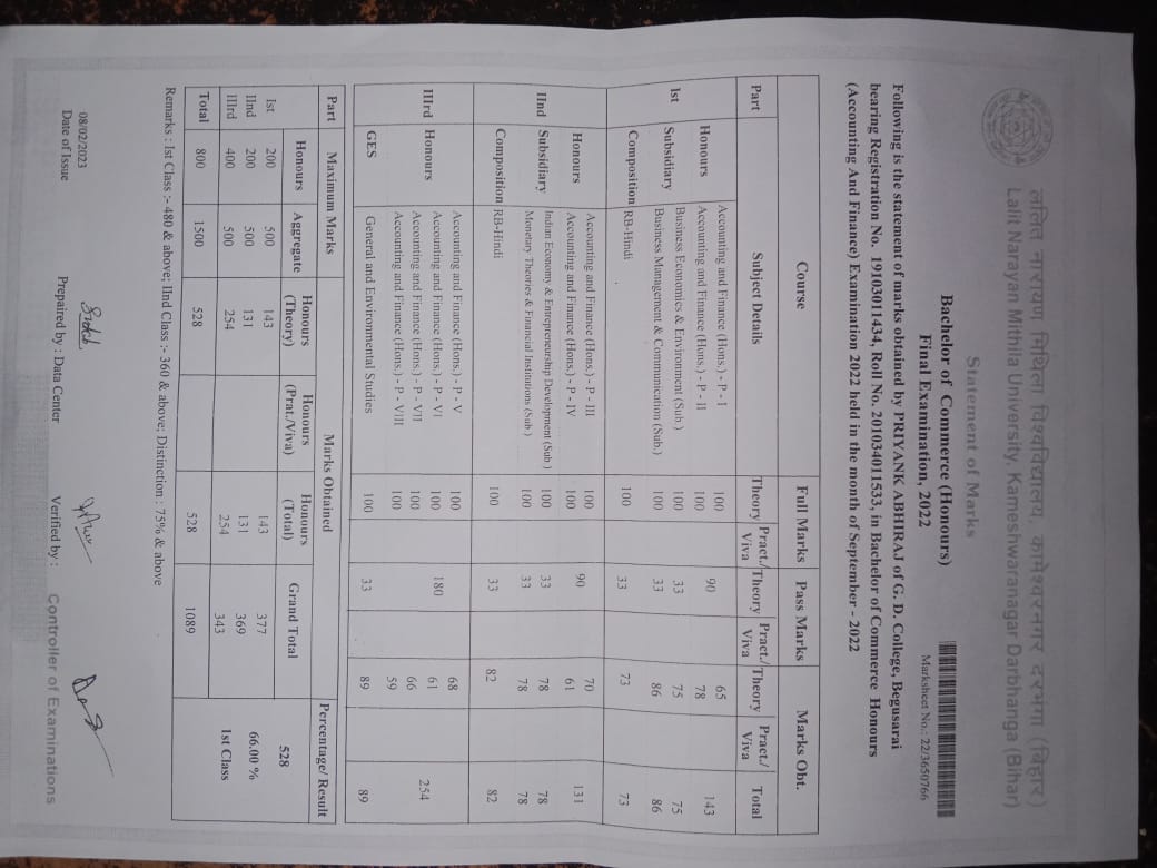 | Exam | Full Marks | Pass Marks | Marks Obtained |